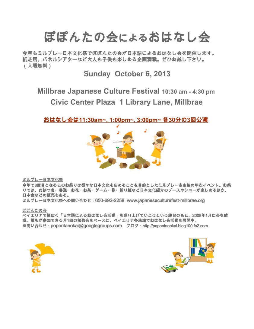 ごぶさたしています。 ぽぽんたの会は今年もミルブレー日本文化祭りに参加させていただくことになりました。 紙芝居、手遊び、読み聞かせなどなど、楽しいおはなし会になると思います。(入場無料です) お誘い合わせのうえお越しください