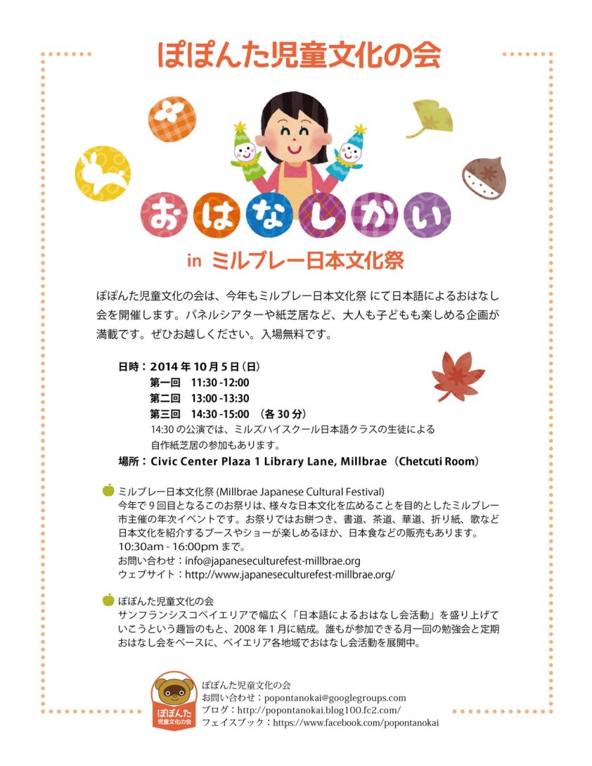 ぽぽんた児童文化の会は、今年もミルブレー日本文化祭 にて日本語によるおはなし会を開催します。パネルシアターや紙芝居など、大人も子どもも楽しめる企画が満載です。ぜひお越しください。入場無料です!