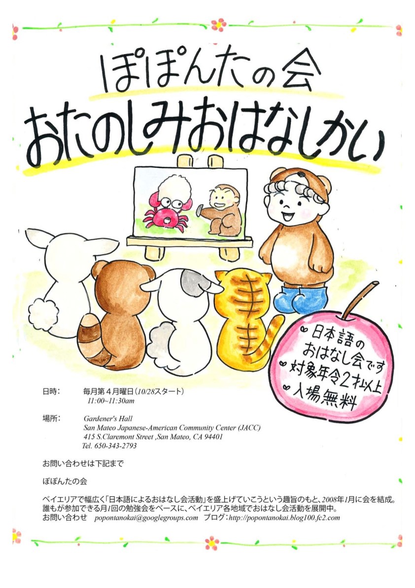 あっという間に師走も半ばを過ぎました。ギフトなどのお買い物や年越しの準備でお忙しい時期ですが、いかがおすごしでしょうか。ぽぽんた児童文化の会では今月もおはなし会を開催します。クリスマスにちなんだお話を沢山ご用意していますので、どうぞお楽しみに。ベイエリアも雨が降って寒い日が続きますが、温かくしてお過ごしください。