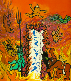 軽業師(かるわざし)のそうべいが、綱渡りに失敗して命を落とし、地獄へと送られます。糞尿地獄、熱湯釜ゆで、針の山といった刑地を仲間たちと大暴れする様子が、抱腹絶倒の関西弁でつづられています。この絵本の楽しさをもっと広げたい、とぽぽんたの代表が迫力ある立体紙芝居にしました。