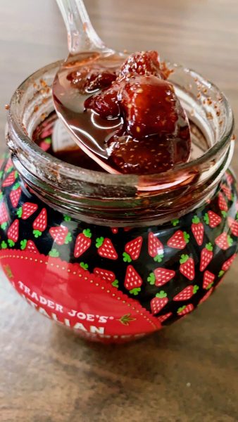 おやつももちろんいただきました。ごまもちと、手作りパンです。写真のトレダージョーズの新商品、イタリアンストロベリージャムを添えて。ころっとしたいちごがとろとろの蜜にひたってパンによく合うんです。
