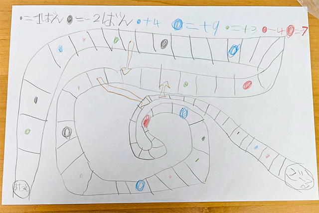 他のお子さんでは、最初レターサイズの紙1枚に書いていたのですが、2枚をテープでつなげ、次は4枚…とだんだん大きくなっていって、最終的には8枚つなげた紙で作っていました。『?つすすむ』『?かいやすむ』など、ひらがなやカタカナを書く練習にもなるし、橋(ハシゴ)を掛けて大量に進めたり、戻らなきゃいけなかったり、すごろく作りが楽しそうでした。」